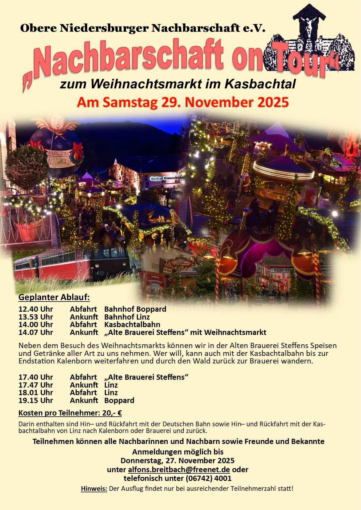 Einen Ausflug der besonderen Art erwartet die Nachbarinnen und Nachbarn der Oberen Niedersburger Nachbarschaft am Samstag, den 29. November 2025 - es geht zum Weihnachtsmarkt an der "Alten Brauerei Steffens" im Kasbachtal bei Linz /Rhein.